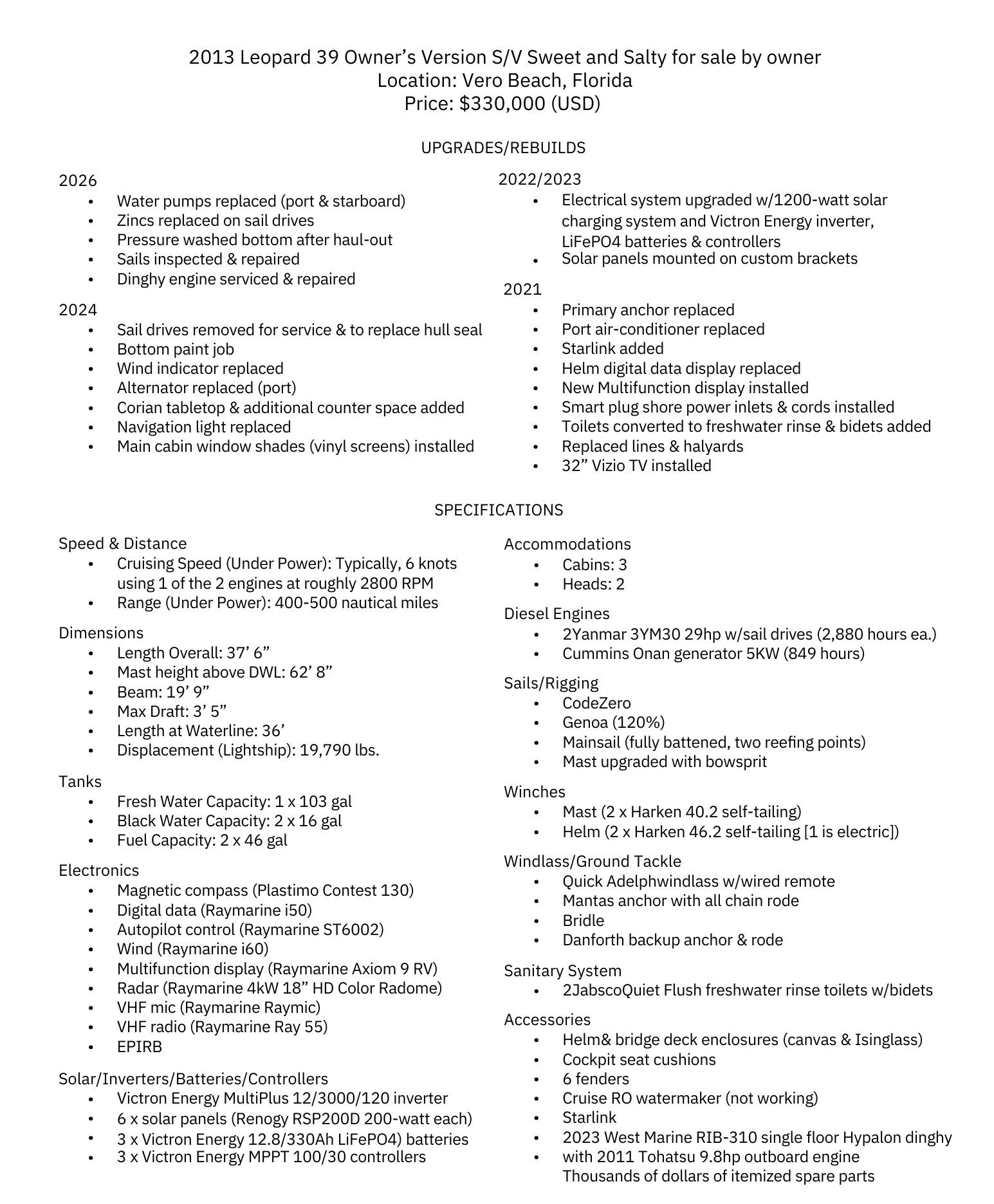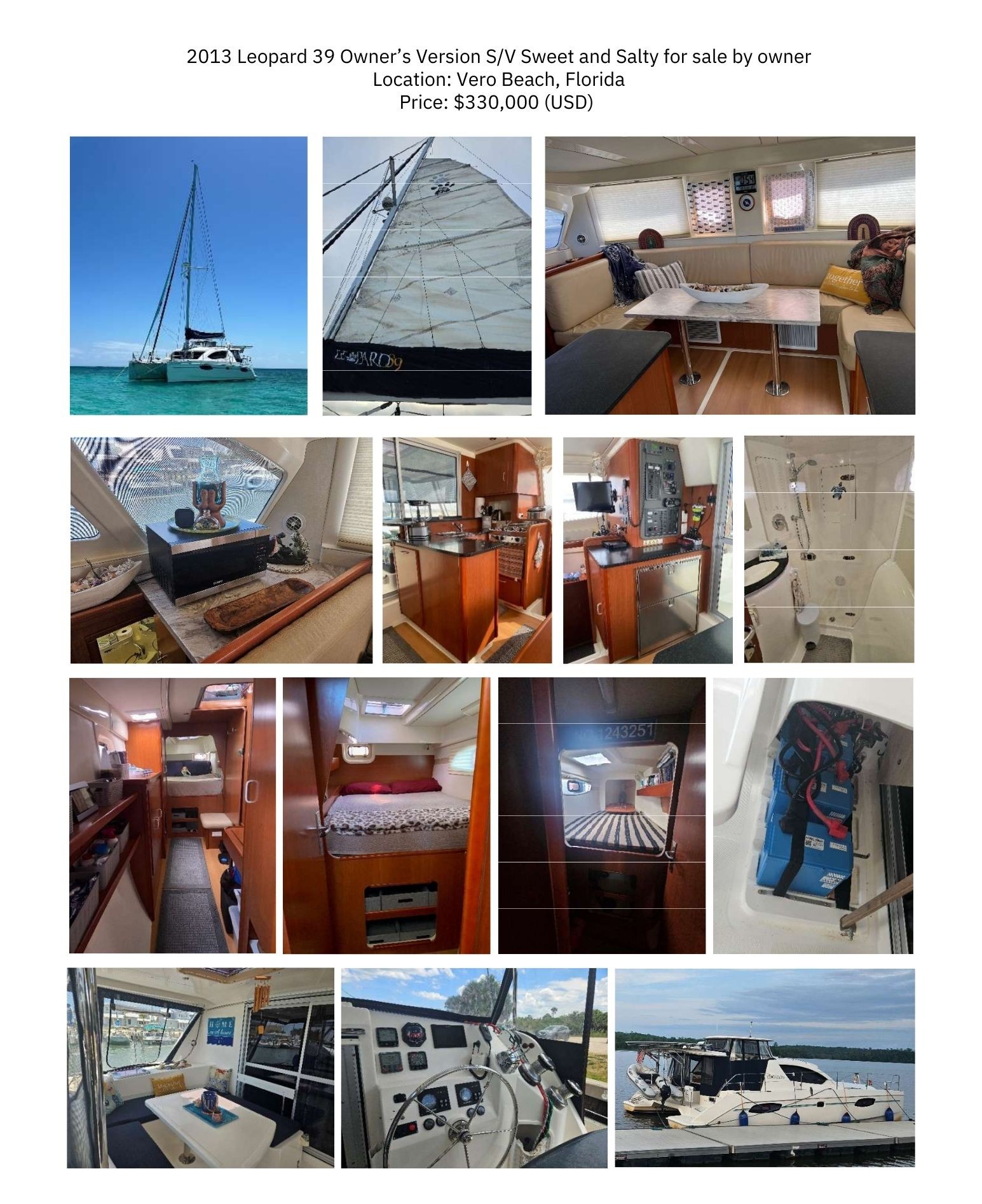 Sweet and Salty is an Owner’s Version 2013 Robertson & Caine Leopard 39 Sailing Catamaran that comes loaded with many cruising goodies such as 1200 watts of solar, Victron Energy inverter, batteries & controllers, a Cummins Onan diesel generator, a fully enclosed cockpit, Starlink, and plenty of itemized spare boat parts to enjoy blue water cruising and remote anchorages. Sweet and Salty has been regularly maintained and was never in charter service. The tender is included. She is currently located in Vero Beach, FL and is USCG Documented.